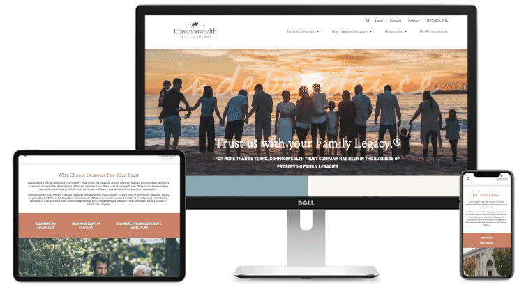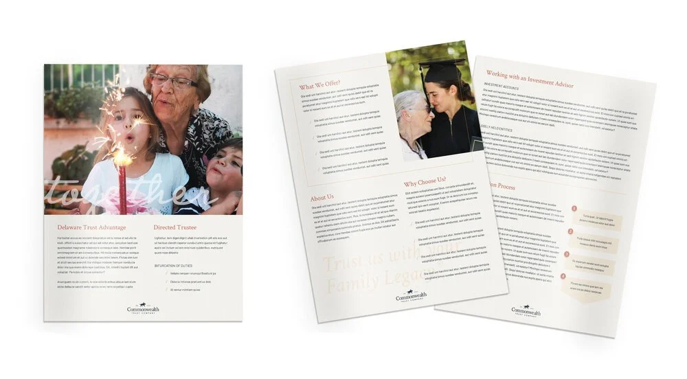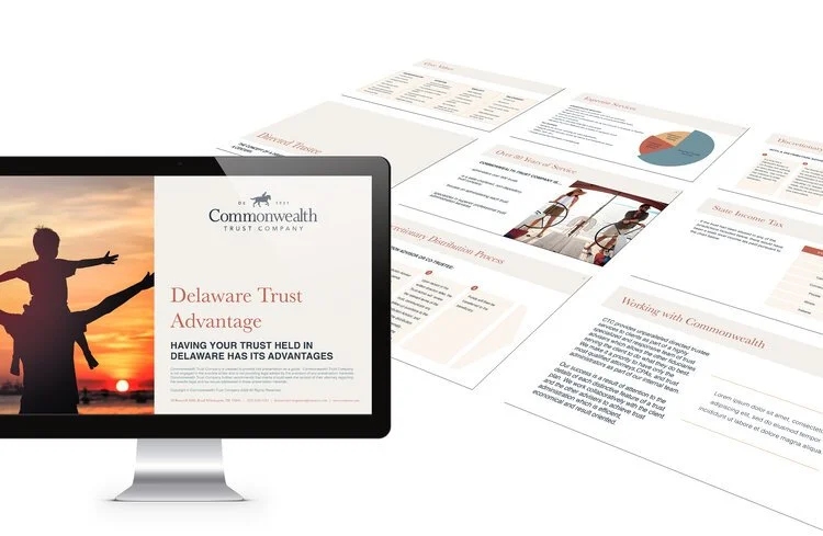 Commonwealth Trust Company is a Delaware-based trust company that provides administrative directed trustee services for high-net worth clients. With over $11.6 billion in assets under administration, Commonwealth works in a B2B2C model, partnering closely with a client’s team of existing lawyers, wealth managers, and other advisers who, in turn, protect their clients’ legacies. Commonwealth has a rich history of serving the Delaware community, with over 80 years in operation, but CEO Caroline Dickerson looked to The Moving Company to bring the brand into the 21st century. Our team worked with the Commonwealth leadership team to breathe new life into a respected trust company.