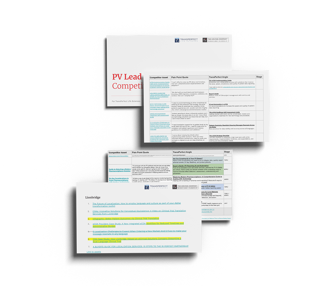 Next, we turned our focus to TransPerfect’s pharmacovigilance and safety and eCOA solutions. We completed two competitor content audits to see how we could make TransPerfect’s solutions stand out in a crowded marketplace. Each audit included a copy exercise where we built personas and wrote quotes for common pain points. These quotes helped us relate to our audience’s mindset and ensure that the lead generation asset we created would address their pain points.