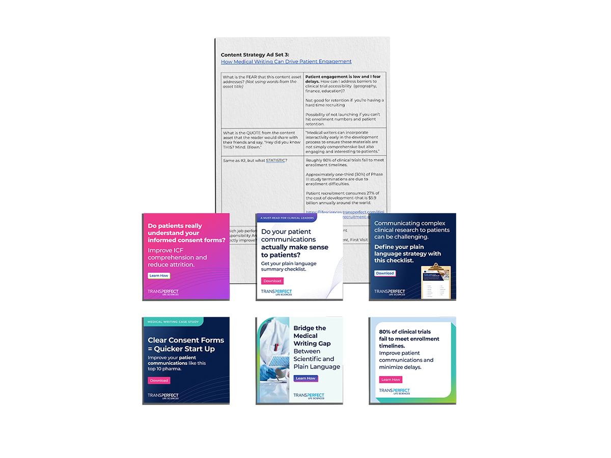 Next, we turned our attention to the company’s medical writing solutions. After conducting another competitor content audit and strategy session with TransPerfect’s team, we determined an informed consent lead magnet to be our next direction. Our team conducted a thoughtful SME interview with the medical writing lead to determine the next asset’s viability. Scripting interview questions, pulling examples, and writing a brief content outline set us up for success in the SME interview. Next we wrote the “Informed Consent Form Checklist and Free Template,” a practical and interactive lead magnet to support patient engagement and understanding in the very important phase of patient consent. Corresponding LinkedIn ads, email, and blog post also support the lead generation campaign.